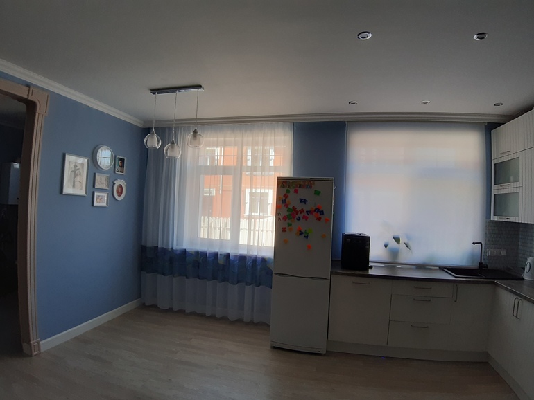 Весь могз проели! ))) Девчат, помогайте! Нужны шторы на окно около столовой группы. На втором окне просто белая рулонка. Стены во всей кухне-гостиной однотонные голубые. Имеющийся тюль - временный вариант.