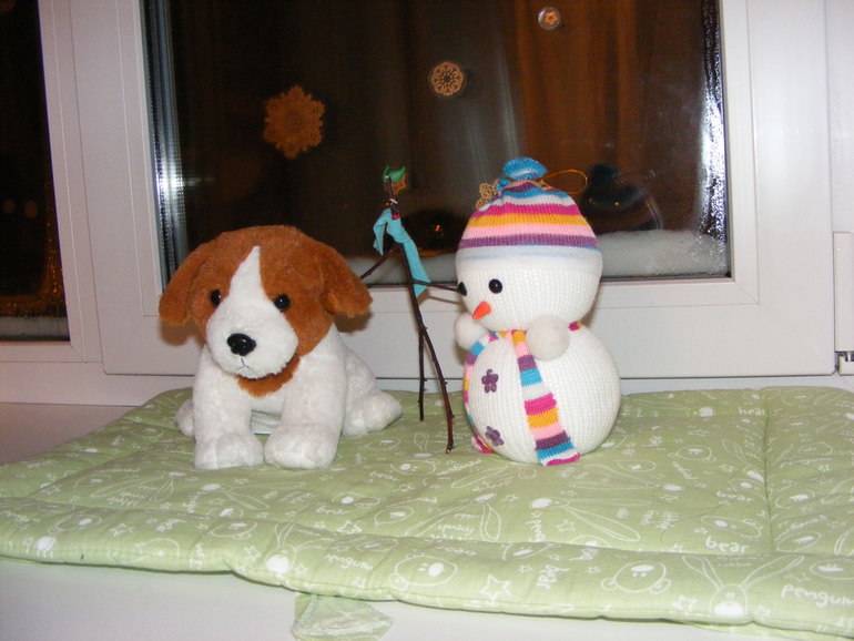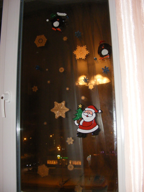 Квартиру мы украсили в этот раз только снежинками на окна и наклейками забавных пингвинов. Все сам! Роднульке очень нравится отрывать животики-наклейки пингвинам и приделывать их назад, а еще дуть на них - хохочет!