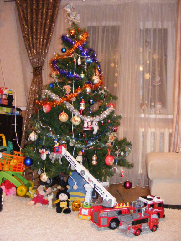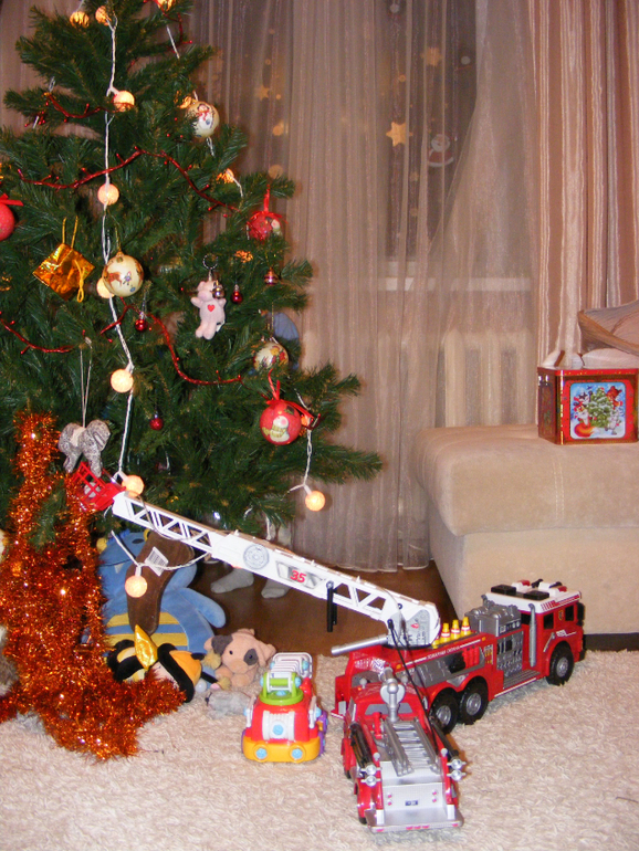 А еще папа сказал, что пожарные машины усаствуют в процессе наряжания больших городских елок, и тут же все большие пожарные машины нашего дома примчались украшать елочку.