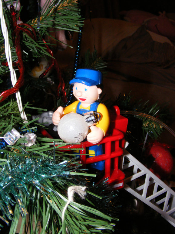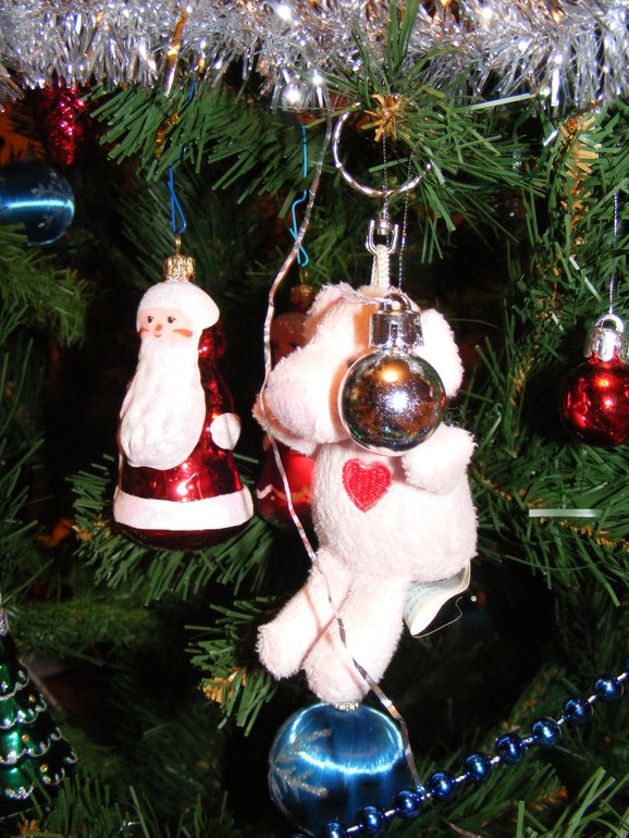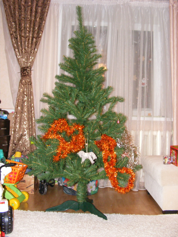 Гирлянду вешал папа - это традиция. Сначала гирлянда, потом украшения. Но папа пришел с работы поздно. Карапуз никак не мог дождаться и стал наряжать елку сам, так как умеет ) Вот что из этого вышло.