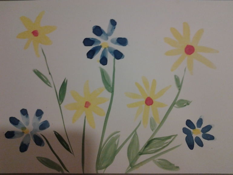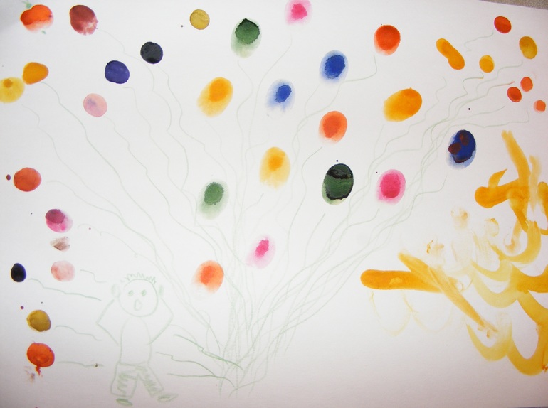 У всех, наверное, подобные картины уже с года есть. А мы вот только нарисовали! Наконец-то сын позволил испачкать себе ручки ) Чистюля ) Хохотал и шлепал разноцветные цветочки. Надолго, правда, не хватило, побежал руки мыть и машинки катать.
