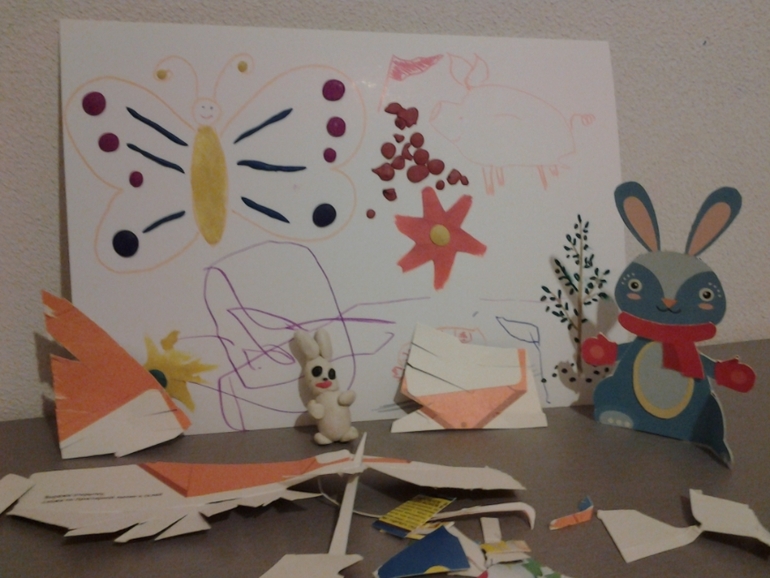 А сегодня просто взял и начал стричь. Мне под руку попалась коробка из-под мишек Барни. И уселась выстригать зайца. Маленькие ножницы положила рядом. Прибежал пельмень, взял ножницы, взял салфетку и начал стричь.