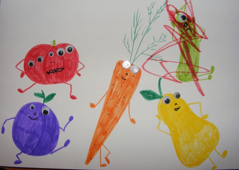 Вот такие у нас получились. Я рисовала, сыночек глазки клеил. Огурцу решил 1 приделать ) А помидорке я предложила несколько. Работай скворечик мой оказался довволен. сказал, что больше всех ему понравился огурец. Его-то и раскрасил )