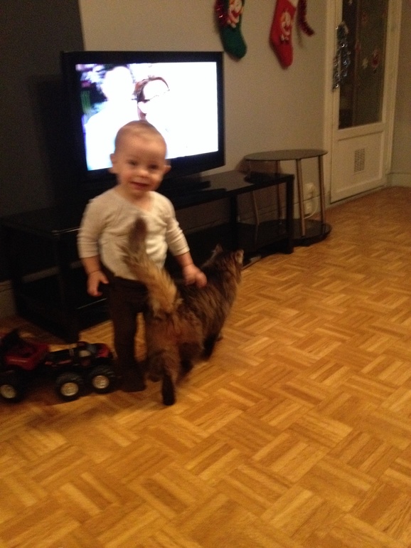 Видишь, да?))))) Додумался ж еще вот так обхватить не и сидит довольный))))) Стрижка его сильно изменила; он стал более взрослым с ней