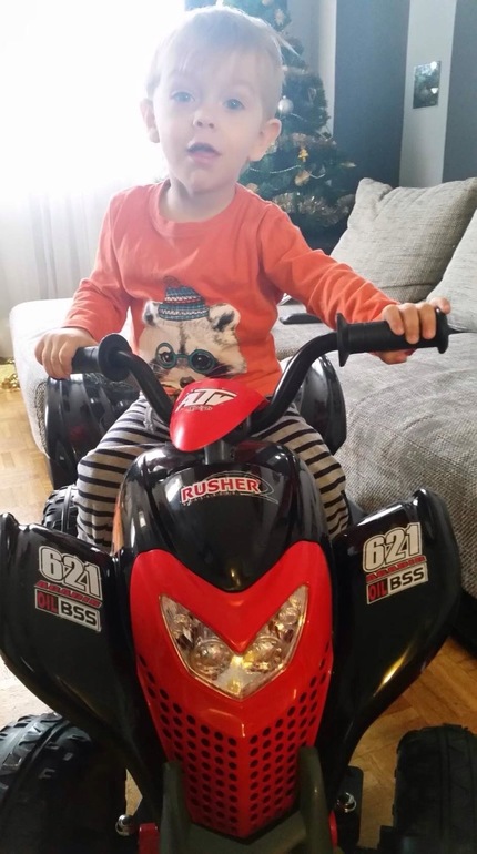 На другой день приехал папа с подарками и подарил сыну квадроцикл и машину