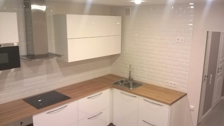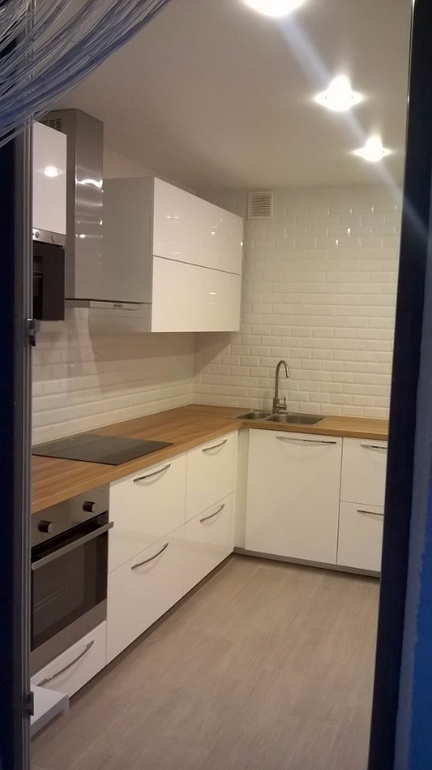 Фасады белый глянец , столешница мелекулла, плитка бисселадо бланко.