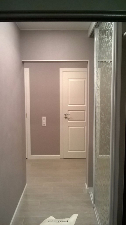 Коридор крайне неудобный и непонятной формы. В коридоре в нише шкаф -купе(заказывали у частника ) и будет банкетка(делаем на заказ фото приложила ). Двери финские jeld-wen . Входную дверь менять не стали, заменим только накладку на светлую.Обои витория стеновая- ужасные по качеству , швы видно во многих местах .