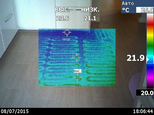 На полу в комнате ламинат , на кухне и в коридоре керамогранит с подогревом. но только в самых необходимых местах . Потолок везде натяжной матовый.
