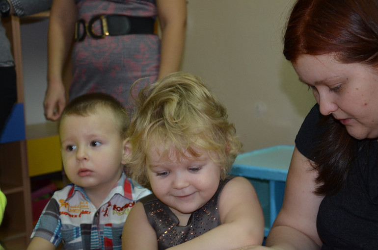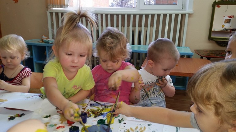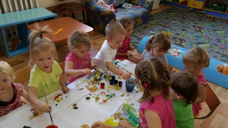 Детишки раскрашивают макарошки для бусиков,моя Милена в розовой футболке)))