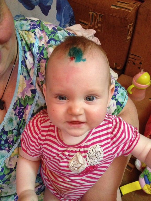 Упала из коляски на бетонную дорожку.. теперь шишка, сине-зелено-красный лоб и рассечение..(( Бабушка с испугу так страшно намазала зеленкой, что конечно еще больше драматизирует ситуацию..((