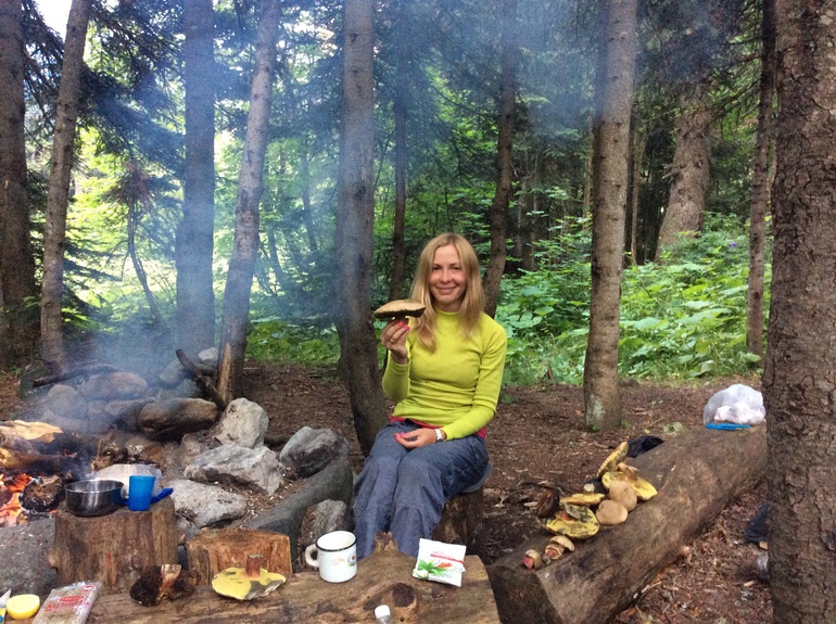 Мы поднялись не много в верх и стали в чудесном лесу, там было полно грибов))) мы готовили борщ, слегка выпивали, мы с Настей голые купались в горной реке, мыли головы, стирались))) приятно вспомнить)))