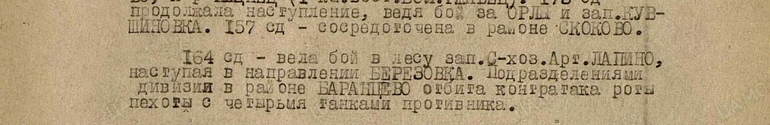 Из журнала боевых действий войск ЗапФ периода с 1.09.1943 по 30.09.1943 я узнала, что происходило с 164 сд именно 6 сентября 1943 года.
