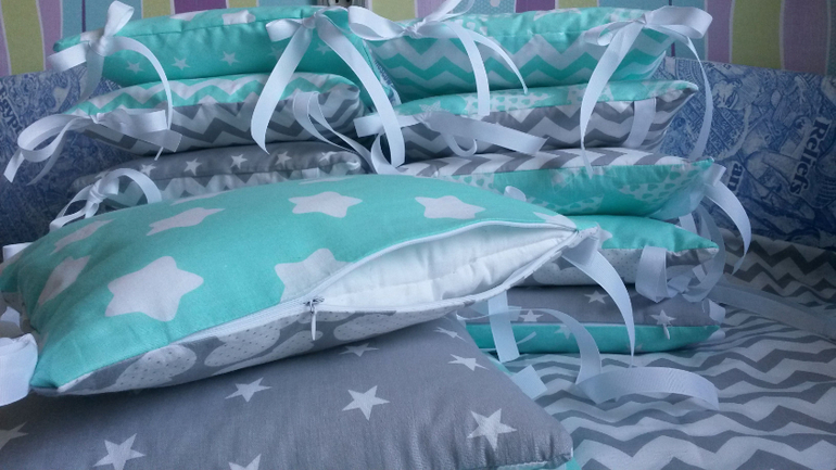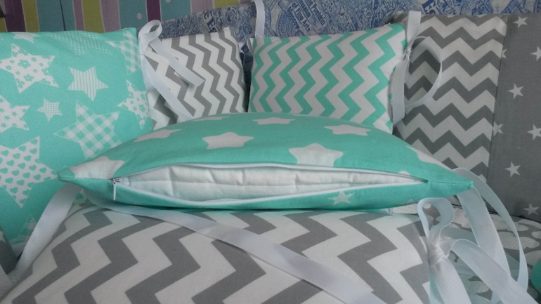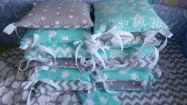 Солнечная полянка / шью для детокГотовый комплект состоит из 12 подушечек размером 32*32 см каждая, сшиты из российского хлопка с использованием синтепона и холлофайбера. Подушки закрывают все стороны кроватки, но при желании их можно использовать по отдельности. Съёмные наволочки на молнии обеспечивают лёгкий уход, но постирать в машинке можно и сами подушки, они быстро сохнут и сохраняют форму,а утеплитель внутри надёжно закреплён. Цена - 3400. Изготовление подобного комплекта с несъёмными наволочками - 2500, ну а ещё возможно сшить любой из комплектов в другой цветовой гамме ) или дополнительно изготовить комплект постельного белья по вашим размерам.