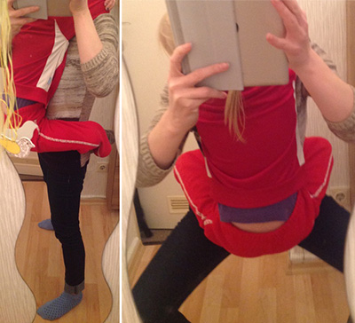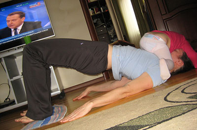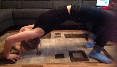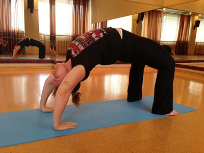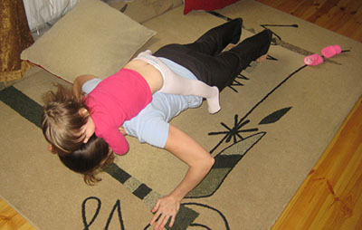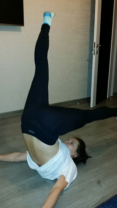 Исходное положение - лежа на спине. Согнутые руки ставим близко к голове, ноги сгибаем и стопы ставим ближе к тазу, поднимаемся в мостик. Это очень сложное заклинание, поэтому его нужно делать аккуратно, находиться в мостике всего 10 секунд и повторить только 2 раза.