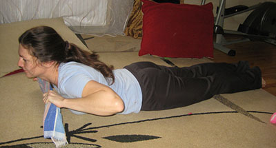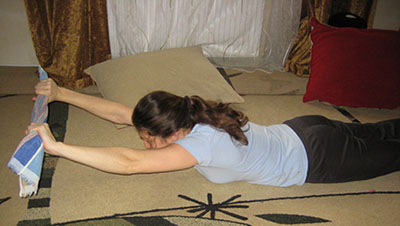 Чтобы обернуться в василиска, ляг лицом вниз, подними грудь от пола и натяни полотенце перед собой на уровне плеч (локти согнуты). Выжми снаряд вперед от себя: руки должны полностью выпрямиться, вернись в исходное положение. Это один повтор. Повтори заклинание 20 раз.