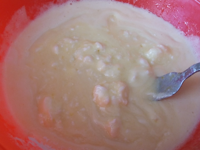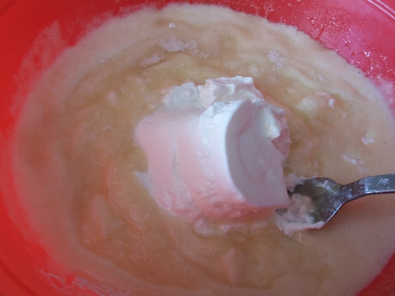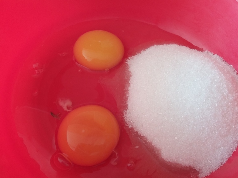 Смешать до пены (вилкой) 2 яйца и 0,5 стакана сахара: