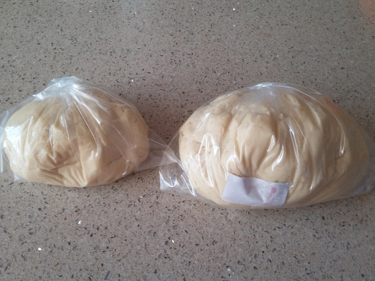 Замесить некрутое тесто, добавляя по необходимости муки. Разложить 1/3 и 2/3 теста по пакетам: