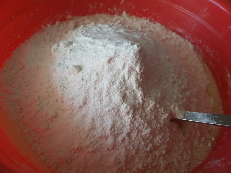 Добавить ванилин, щепотку соли, 1 ч.л. разрыхлителя (или негашеной соды) и 2 стакана муки (потом будем добавлять):