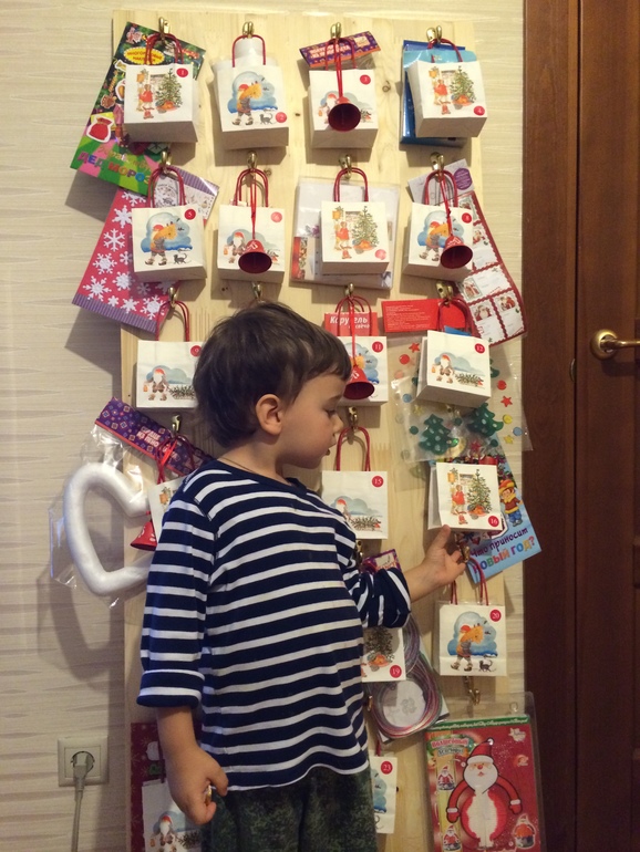 Достать пришлось календарь вечером, после садика, т.к. утром папа нас отводит в сад, а я сплю. Посмотрел он на него оценивающе. Конечно не понял, что это на каждый день сюрпризы, стал везде лазить. А когда нашел шоколадку, так совсем истерика началась. В итоге унесла я календарь назад, закрыла его простыней, стоит он в другой комнате теперь до завтрашнего дня! Буду его каждый вечер выносить и смотреть, что там у нас!