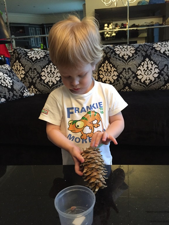 у меня как раз была кедровая шишка с орешками и Степа тоже попробовал извлечь семечки, правда это дело ему не понравилось, т.к шишка внутри липкая в смоле, зато аромат кедра потрясающий)