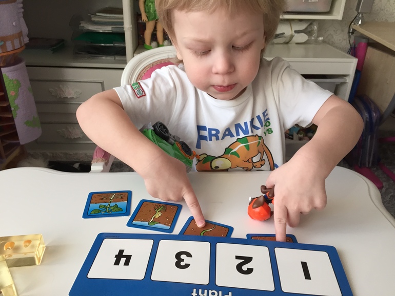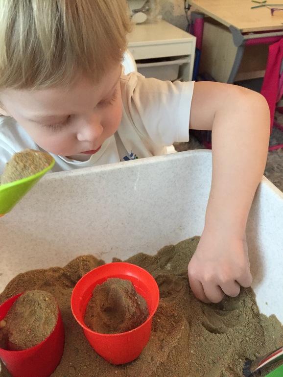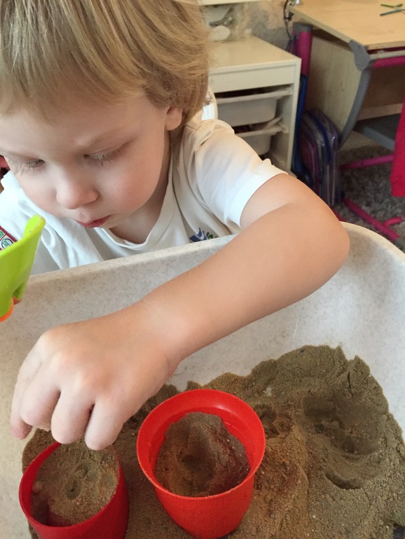 ну а потом я хотела предложить Степе землю и зернышки, но он захотел песочек и семена, на фото не видно, в песке мы закопали горох, фасоль, каштаны, орехи и Степа их сортировал по горшочкам, сажал в песок, а потом все полил))