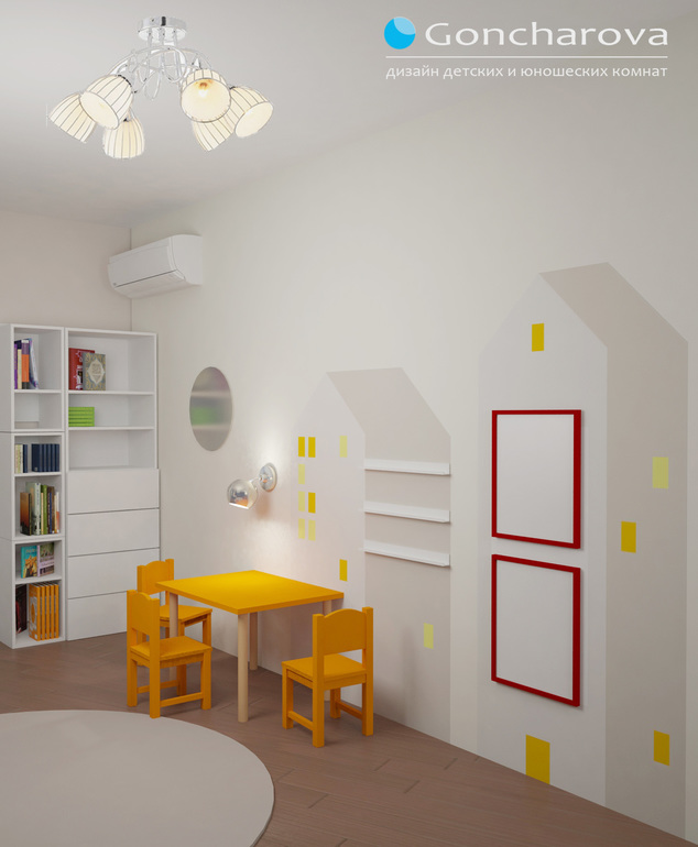 На другой стене появились стилизованные контуры зданий, на которых закреплены доски для маркеров и узкие полки для книг или рисунков.