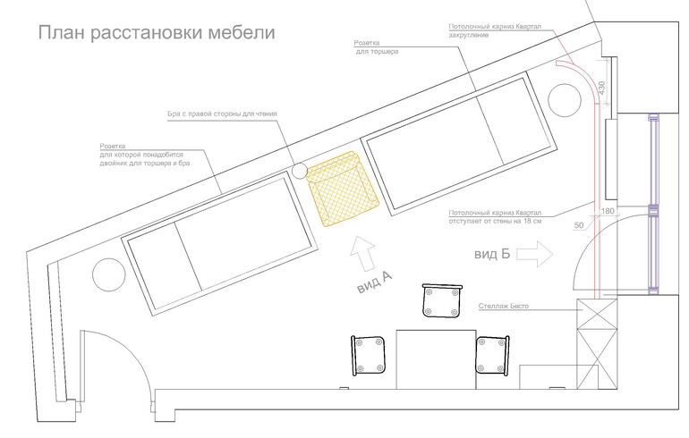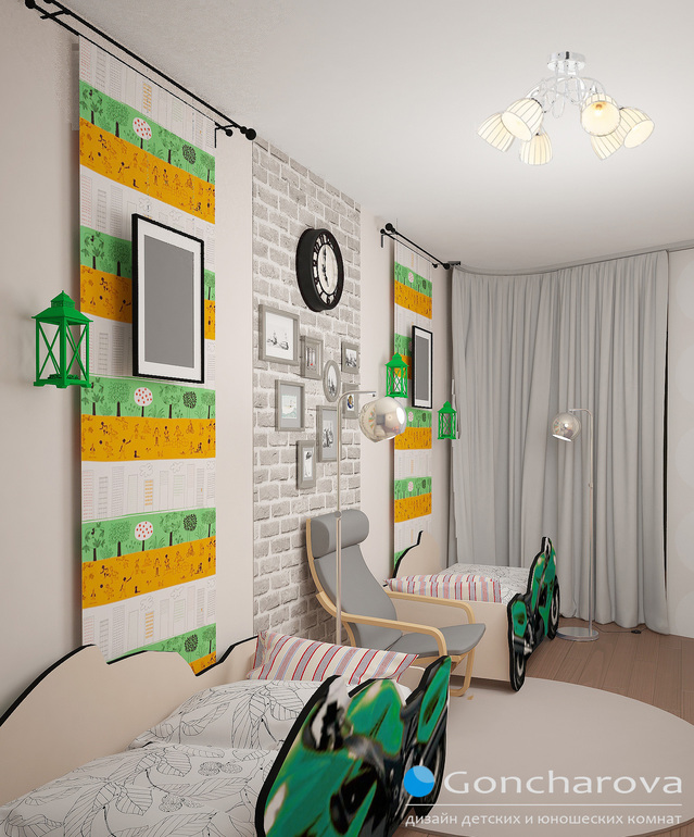 Мои работыЗадание не из простых. Комната в виде узкой трапеции, две кровати в виде изумрудных мотоциклов, комплект оранжевых стульев и оранжевый стол. Все необходимо вписать в интерьер и придумать какую-то тематику. Выручила полосатая ткань из ИКЕА, которая объединила все компоненты: тема города, графика, изумрудный и оранжевый цвет.