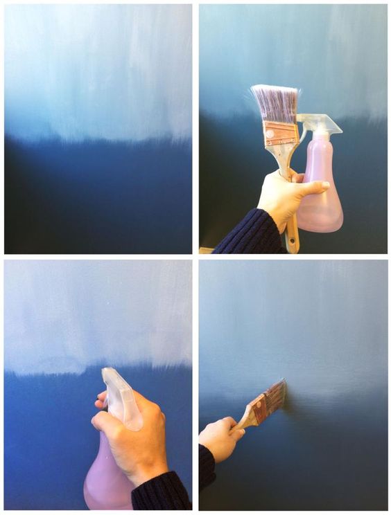 Стена с градиентом - это очень эффектный прием, который лучше всего смотрится в синих или бирюзовых тонах. Граница между двумя тонами растирается широкой кистью по горизонтали.