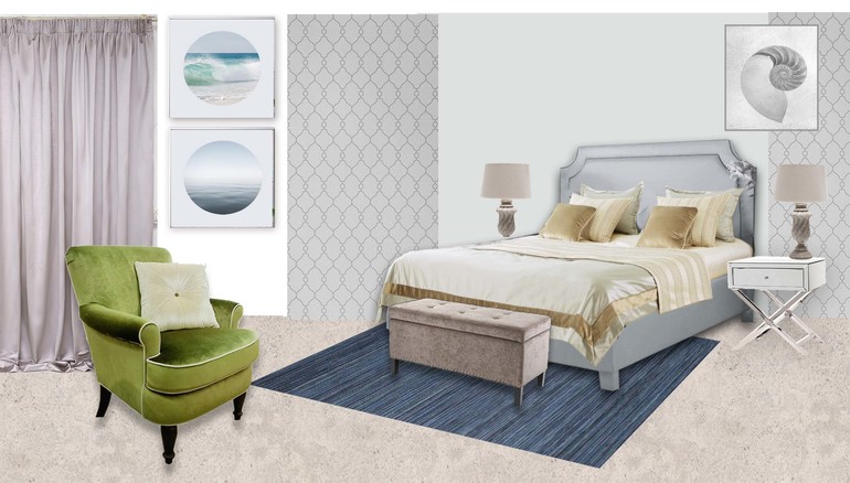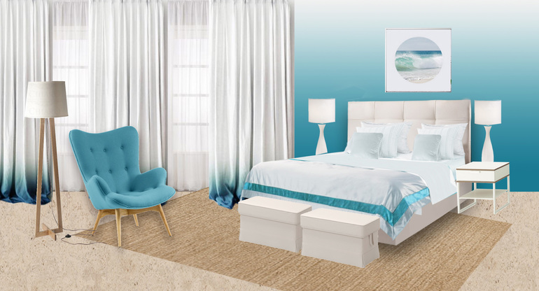 Второй вариант - совершенно иное настроение. Яркая бирюза в сочетании с натуральными текстурами ковра и деревянных панелей. Для этого варианта я подобрала льняные шторы покрашенные ombre, как и градиент бирюзы в изголовье.