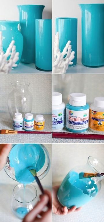 Отличный способ применить остатки интерьерной акриловой краски. Особенно интересно смотрелась бы группа стеклянных ваз разных форм, окрашенных в близкие оттенки. Для этого нужно лишь добавить к колерованному образцу немного белого художественного акрила.