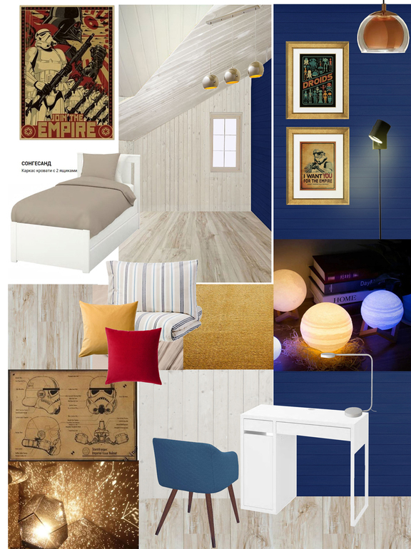 В пожеланиях были: синий цвет и тематика «Звездных войн», одновременно это комната на мансардном этаже с потолком сложной формы и вагонкой на стенах, как сюда вписать сайфай, казалось бы. Но нашлись ретро постеры ЗВ, которые подойдут для загородного стиля, особенно если дополнить несколькими деталями: проектором звездного неба и светильниками в виде планет. База интерьера нейтральная, с контрастной стеной глубокого синего оттенка, который создаст прекрасный фон для постеров в золотистых рамах.