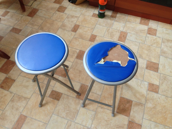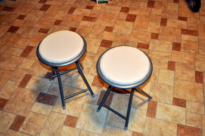 Есть у нас 2 складные табуретки. Собственно говоря, куплены были для походно-пикниковых целей, но поскольку имеется дефицит кухонно-сидельной мебели- используются они на кухне по своему прямому назначению - чтобы сидеть. Т.е. на четверых у нас на кухне 2 табуретки и 2 стула.