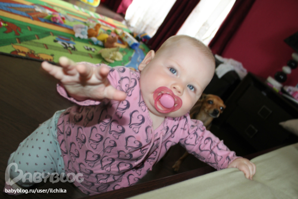 Вероника научиилась сидеть, ходить вдоль кровати и др. опор. Стоит, шагает с поддержкой.