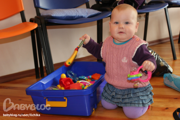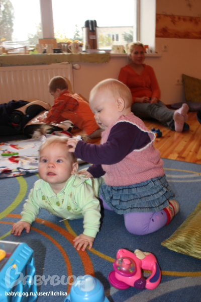 Ходили мы правдо к деткам рожденным весной, но нам очень пнравилось. Было гдето 14 мамочек. Многие детки еще лежат ,не переворачиваются и не ползают. Но были детки как Вероника активные и с умелками. И опять доча добралась до одной девочки и вырывала ей хвостики.:(