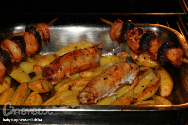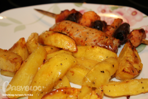 МамулиноЗапеченый картофель дольками, с рулетиком из бекона и сыра и шпажкой с курицей беконом и черносливом!