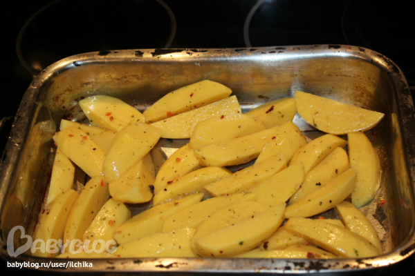 Картофель, чищу, режу, кладу в полителеновый пакет, заливаю маслом подсолнечным ( не много , а то будет жирно) затем специи- соль, перец, сушеные овощи(специя, типо вегетты но без соли). Пакет сворачивю, хорошенько все в нем перемешиваю, и в протвень. Протвень в духовку на 200 гр на час.