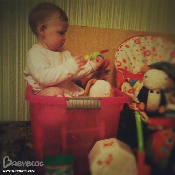 На все пальчиком показывает, и говорит что то на подобии "- что это"? Описать не могу эту фразу, но звучит забавно. Всем интересуется, показывет на то что хочет взять. Умнеет прям каждый день. А сегодня вечером она меня удивила, залезла в ящик для игрушек. И потом ныла, т.к не может вылезт. Заметила что у нее начали появлятся локоны, все таки будет кучеряшка:-) как наш папа:-) . А так все у нас хорошо:-) не болеем славо богу!