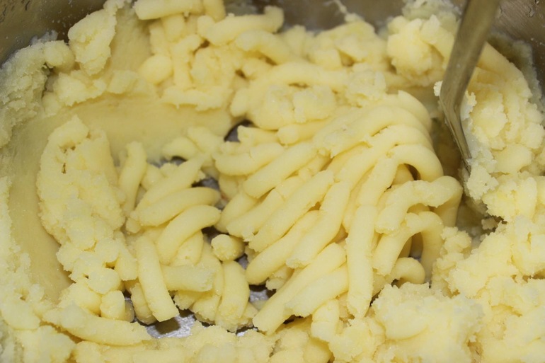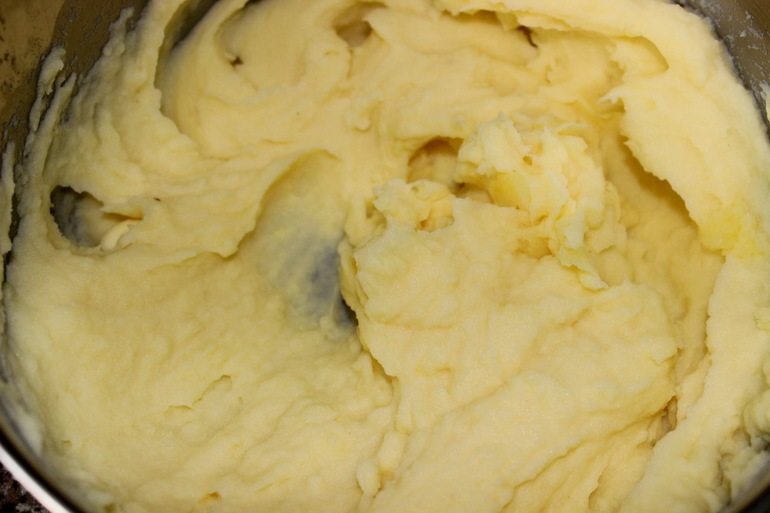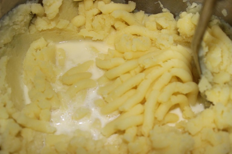 И хорошо как бы взбиваем картофель толкушкой, никоем случае не миксером или блендером.