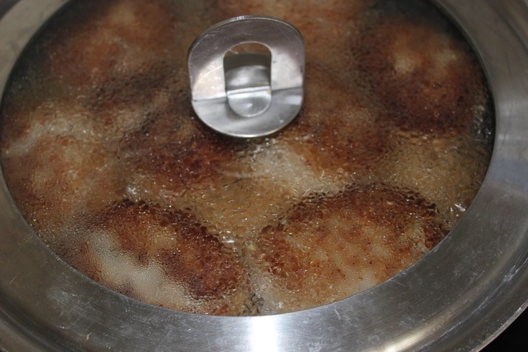 9. Секрет, мы не жарим полностью котлеты, а доливаем воды, что бы они закрывали их меньше чем на половину, накрываем крышкой и жарим- парим минут 15 на огне выше среднего.