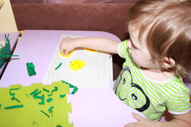 Покушав травки. Наши птенчики отправились на другую полянку, где Верочка кормила их пшеном. (приклеивали на пва птенцов и пшено).