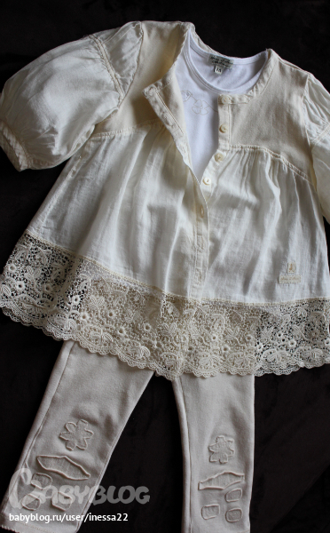 Eliane et Lana дизайнерская Франция р.92-98. Комплект "тройка" цвет шампань:трикотажные брючки-легенсы с апликацией, белый топ и верхняя кофточка с шикарным ручным кружевом. В идеале. 2000 р.