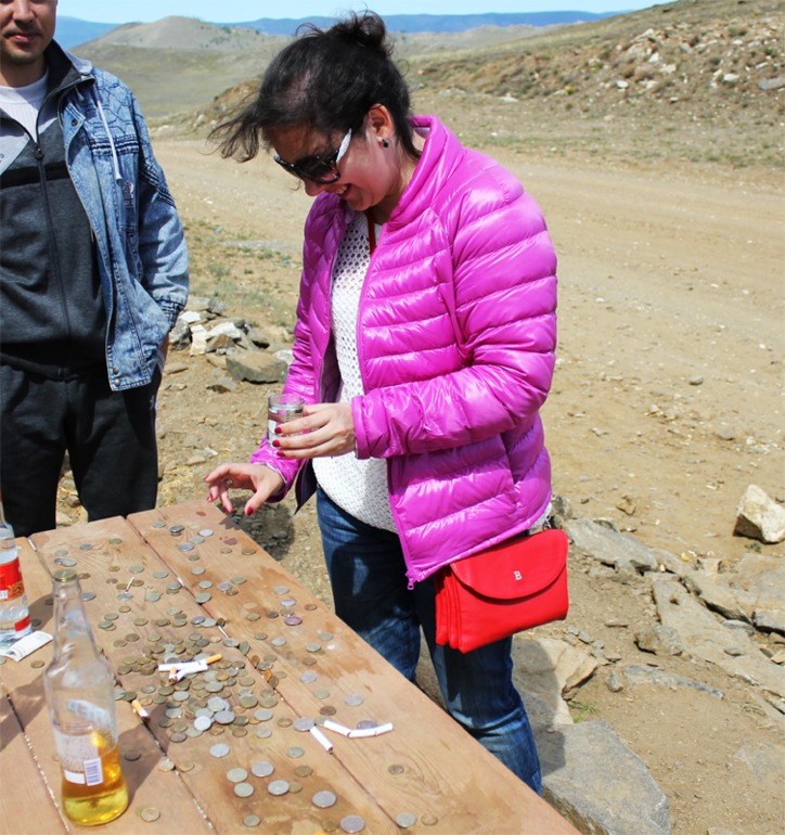 Далее мы остановились в месте, где надо оставить монетки и покапать водкой, безымянный палец мочишь в воде и стучишь им по столу...мы так сделали, а наш гид сказал "Зачем добру пропадать?" И выпил водку...и сел за руль...Мысленно перекрестясь и предупредив, что дома остались дети , сели в машину