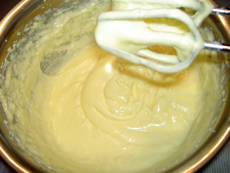 Добавить муку и разрыхлитель теста, смешать миксером:
