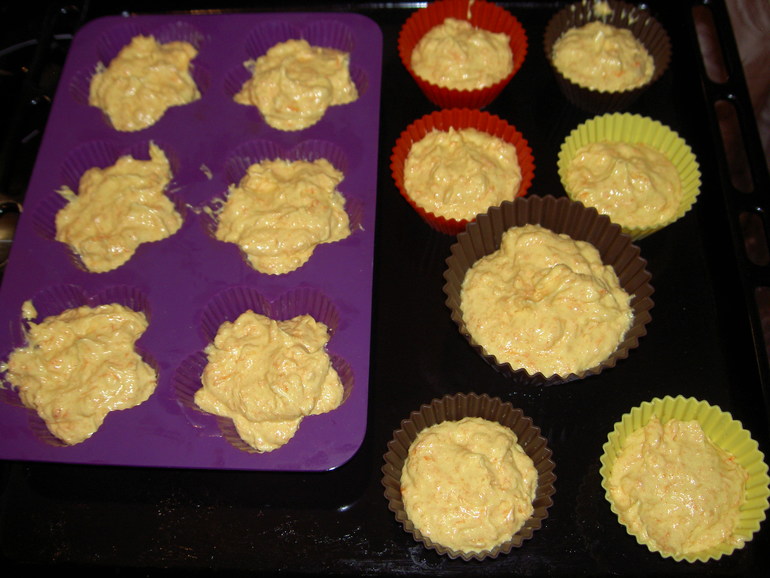 Выложить тесто в формочки на 2/3 высоты и выпекать в разогретой до 180 градусов духовке примерно 25 минут: