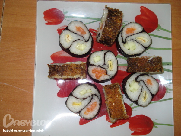 Делала впервые, сам процесс очень увлекает. В начинке лосось, омлет и огурчик. Еще в этот раз попробовала роллы запечь с соусом из майонеза, сыра , соевого соуса и икры мойвы подкопченной., ну и роллы в кляре.