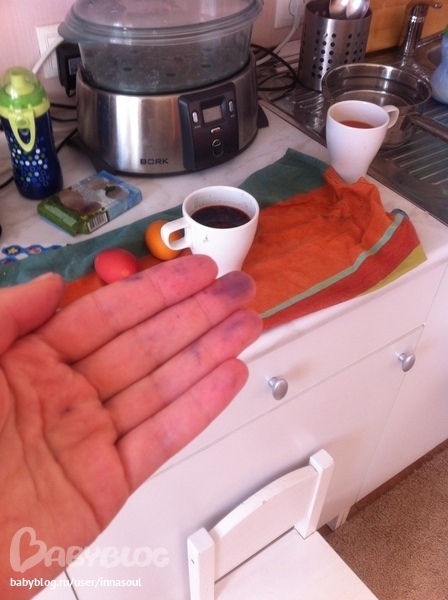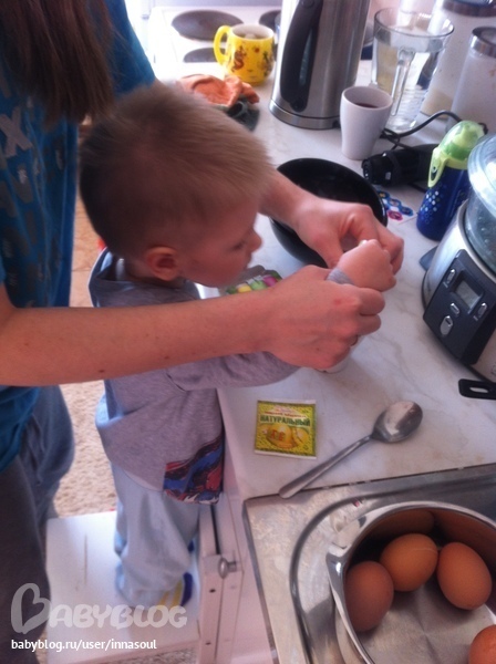 Все проснулись живы-здоровы. Яйца покрасила (и пальцы тоже). С красителями оказалось как в жизни красивая упаковка не обещала простого и красивого содержимого. А вот в простенькой картонной коробочке оказались хорошие красители, подставки картонные , чтоб яйца сохли и даже наклейки. Ник их на стену забацал не по назначению)