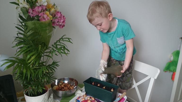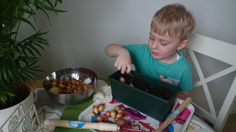 Кирилл посадил в три контейнера: лук на зелень, кухонные травы (кориандр, горчицу, укроп) и петрушку. Сам насыпал землю, я купила ему садовые приборы; сам разрезал пакеты с семенами, рассыпал, сдабривал землю водой, присыпал землю на рассыпанные семена. Хорошее это занятие, полезное для деток.