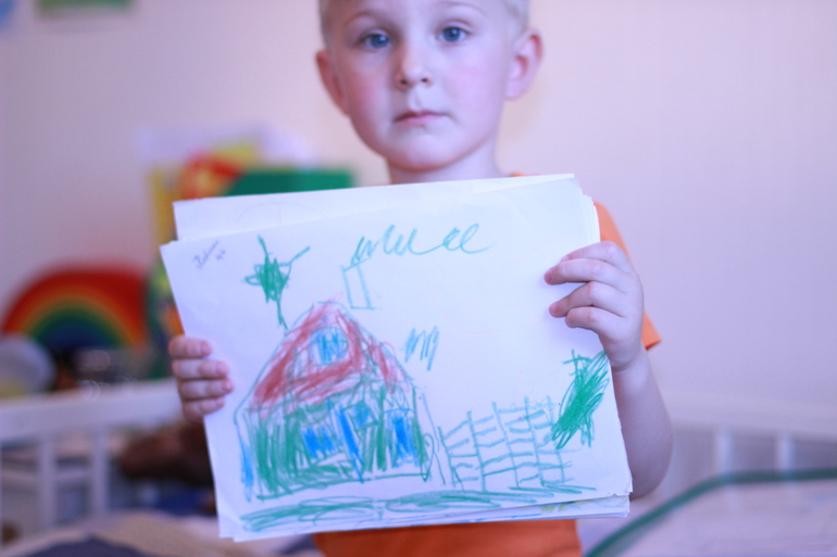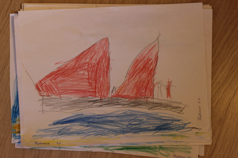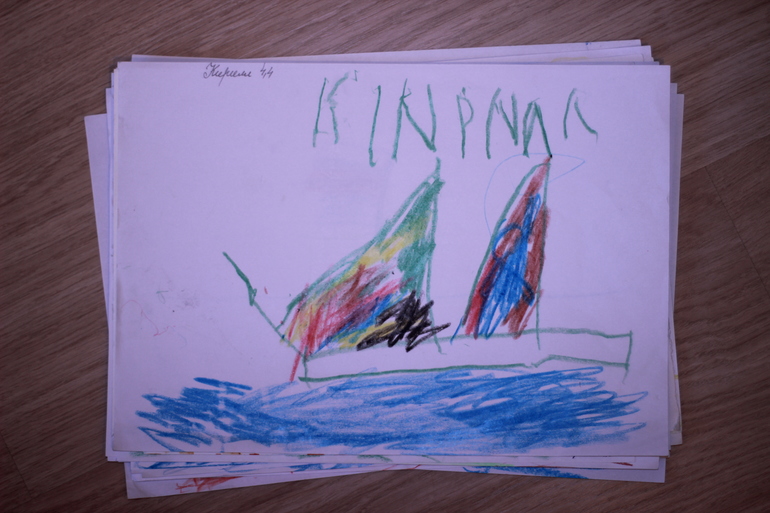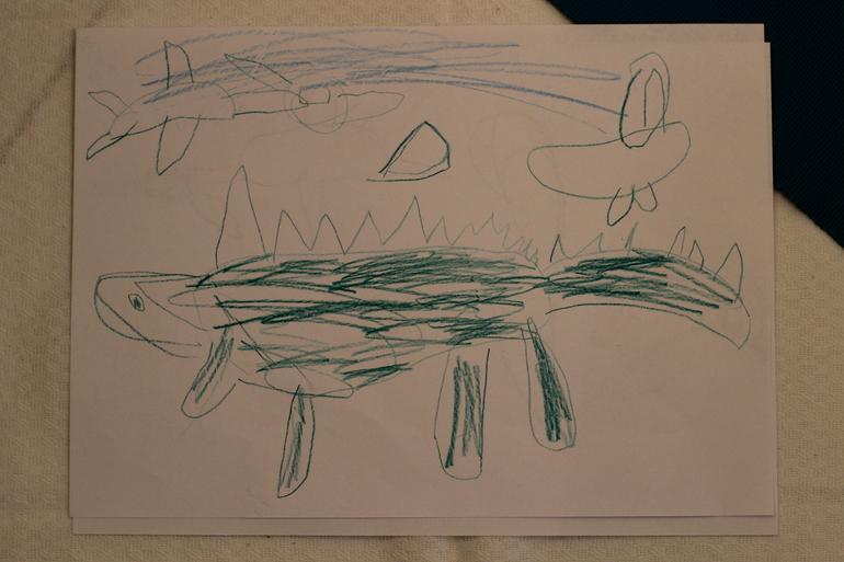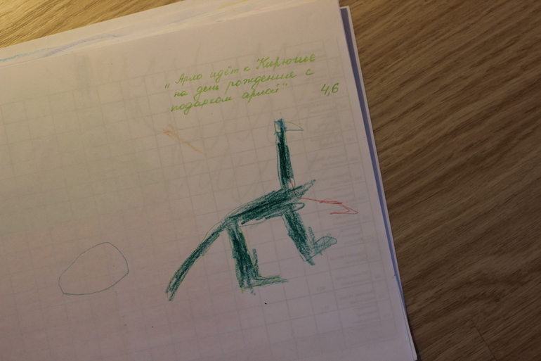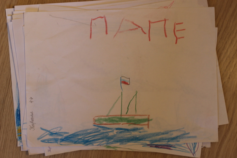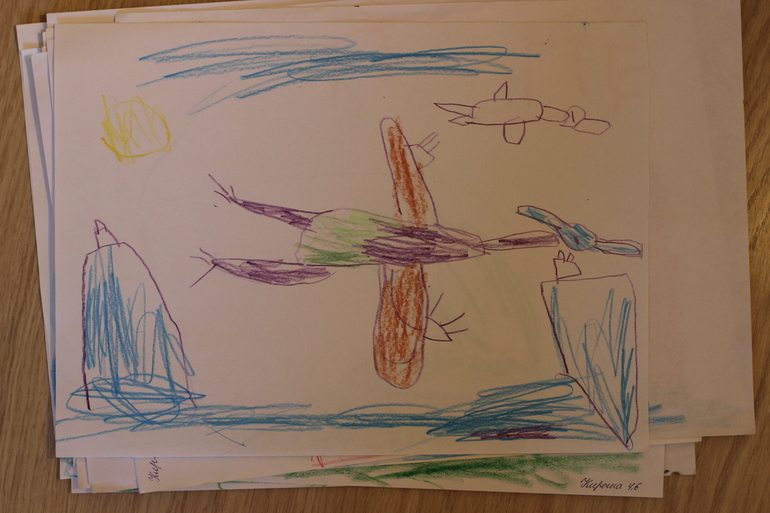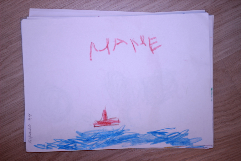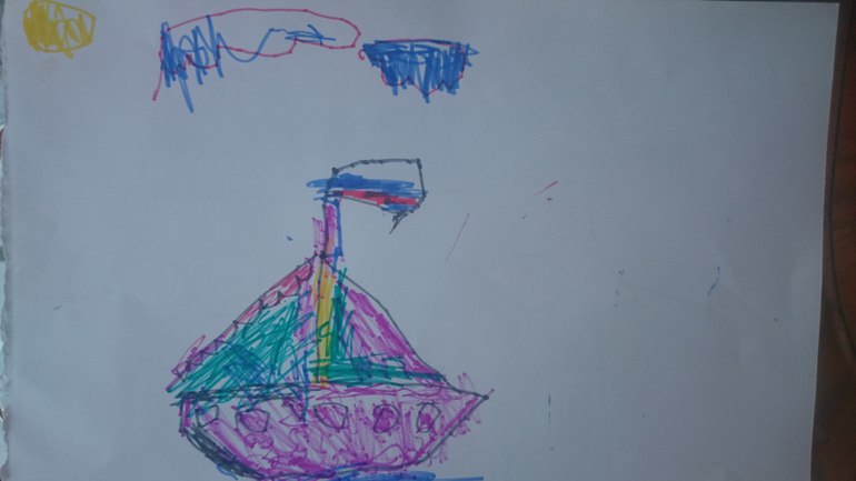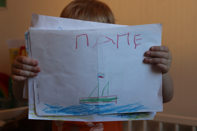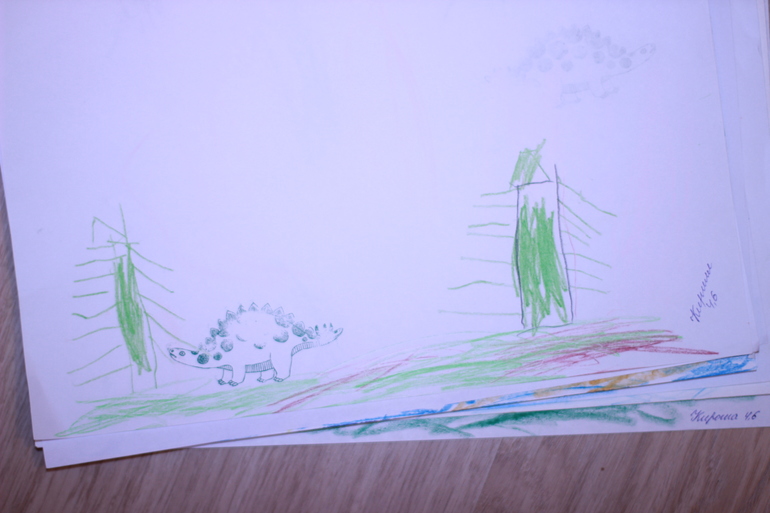 Рисунки. Их много накопилось, я подписываю имя и возраста и собираю в папку. Рисует сам, не настаиваем. Мы рады, что он начал рисовать, до этого он был совершенно нерисующим ребенком.