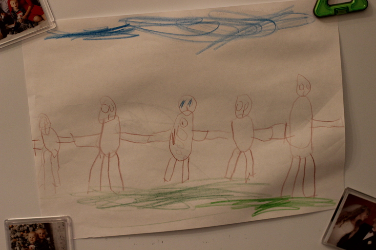 попросила его нарисовать нашу семью (я заранее почитала статью об интерпретации детского рисунка "моя семья"), интересно получилось. Все примерно одинаковые, папа чуть больше (значимее для него), он в середине между папой и мамой, он одинаковый со всеми кроме папы (папа для него самый важный человек), у меня отметил голубые глаза и пуговички на пальто, все за руки держатся