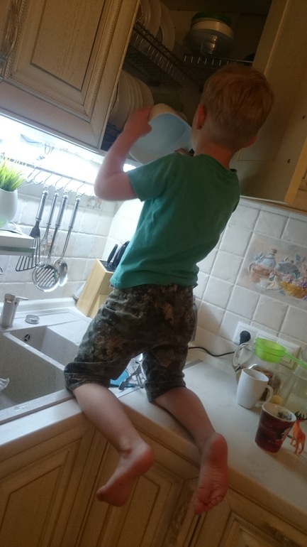 изъявил желание мыть посуду. Принес стульчик, встал и начал мыть. Вымыл достаточно хорошо, чисто.